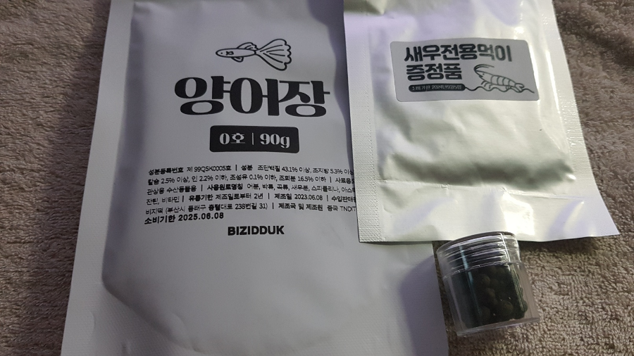 예전에 안시할때 ㅂㅈㄸ에서 먹이사서 잘 키웠던 기억이 있어서 또 구매를 해봤습니다. 양어장 0호는 양어장시리즈 중에 입자가 가장 고운 사료입니다. 물에 넣으면 거의 바로 가라앉고요. 옆에 두 가지는 증정품이라 한 번도 안 써본 사료들입니다.