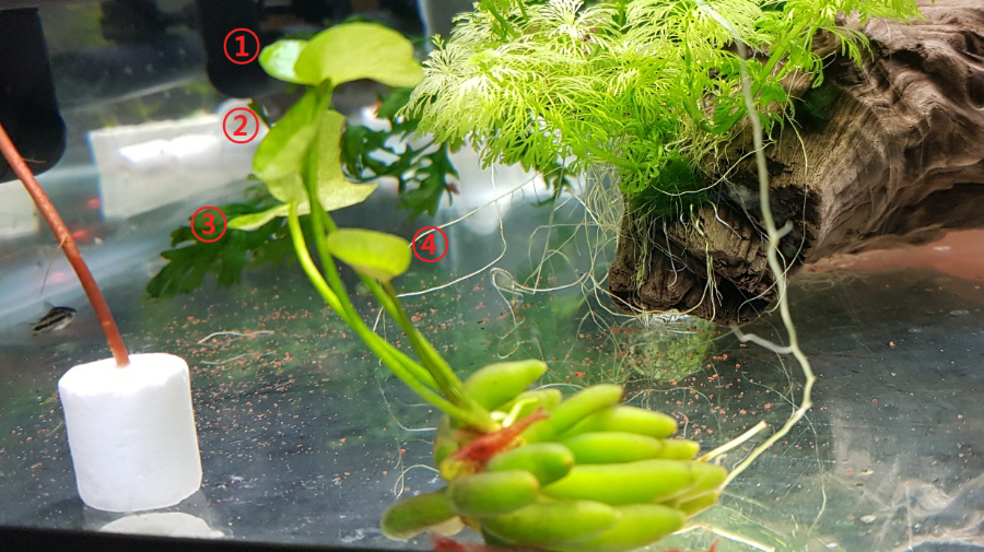 물에 잘 가라앉던 바나나 플랜트는 ①,②,③번 잎까지 있었는데 화살표에 있던 작은 싹이 ④번잎이 되었습니다. 기존잎들은 성장이 별로 없는데 새로 나오는 잎은 성장속도가 엄청나네요 ㄷㄷ 벌써 기존에 있던 잎들과 크기가 흡사해졌습니다.