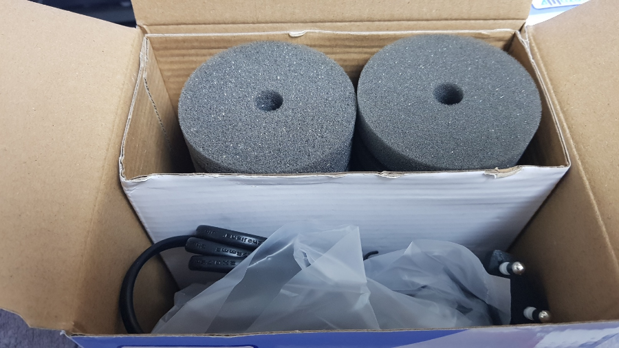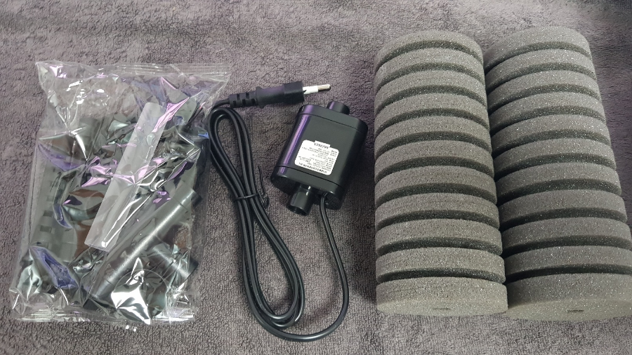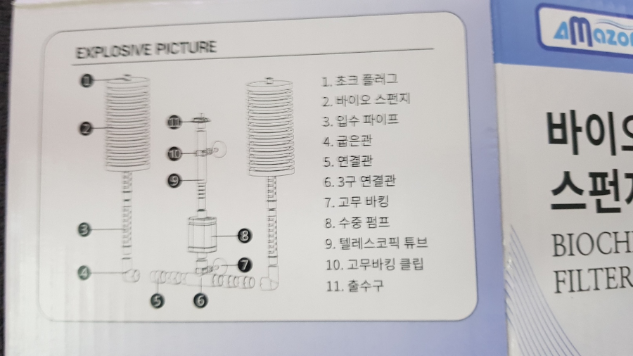 과대포장 이런거 없이 딱 사이즈 맞는 박스에 포장이 되어있네요. 스펀지 2개/수중모터/조립파이프로 구성되어 있습니다.