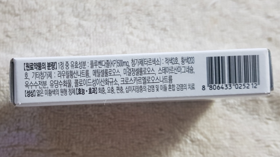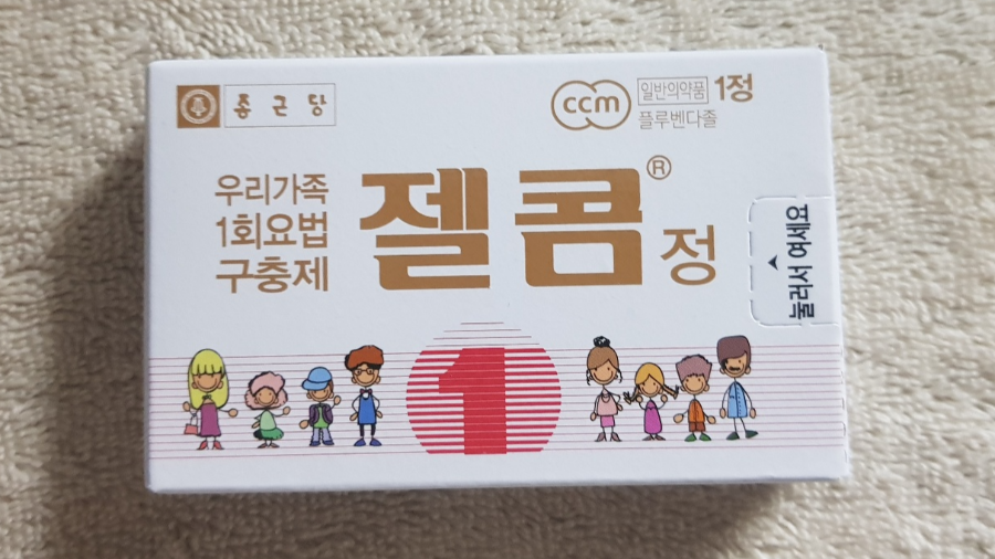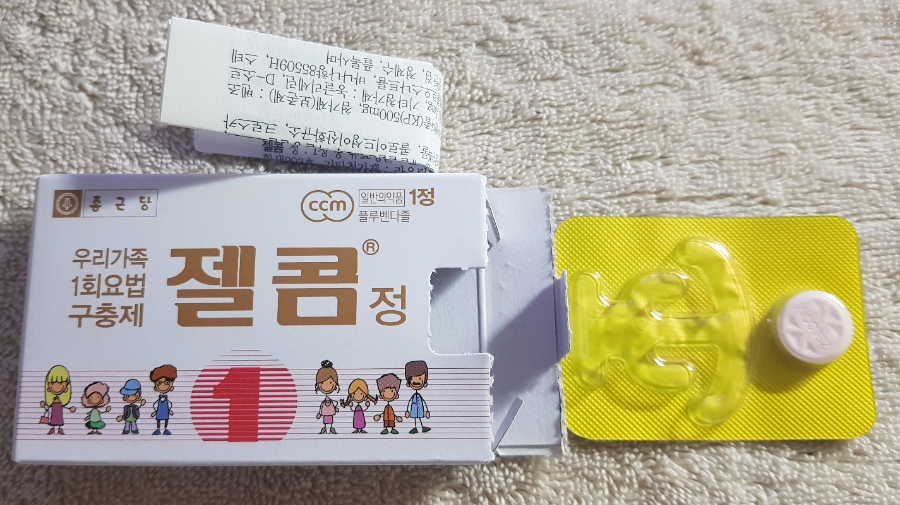 젤콤은 사람이 섭취하는 구충제로 플루벤다졸 500mg이 들어있는 약품이네요. 젤콤 현탁액이라고해서 액상으로 나오는 제품도 있다고 합니다. 저는 마침 방문한 약국에 젤콤 정으로 판매를 하고 있어서 천 원에 구매했습니다.