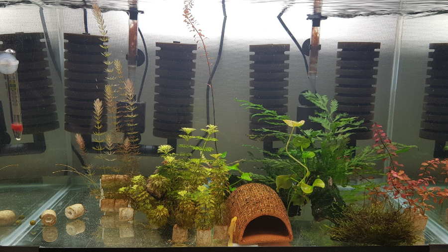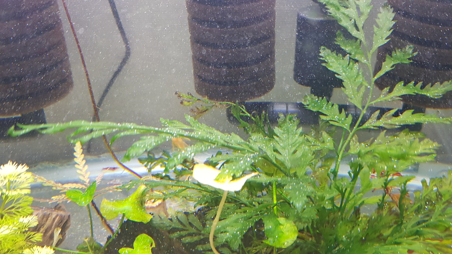 여과기를 키고 다시 30분 정도가 지나니 날아다니던 가루들이 다 사라졌습니다. 어항 바닥과 수초는 여전히 희끗희끗합니다 ㅋㅋ