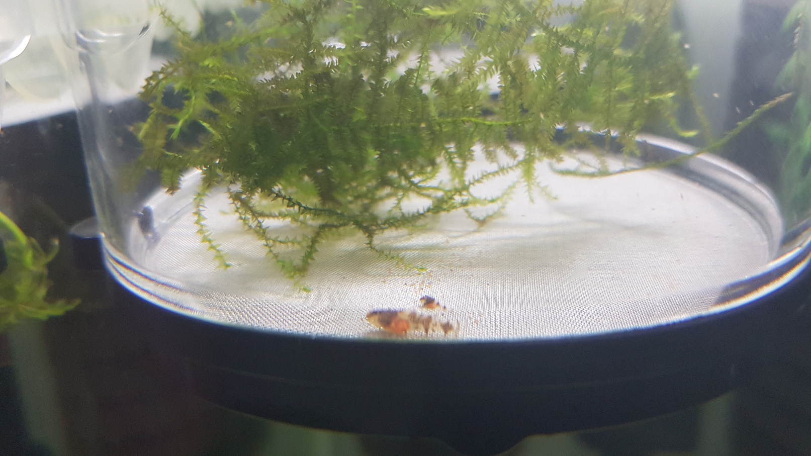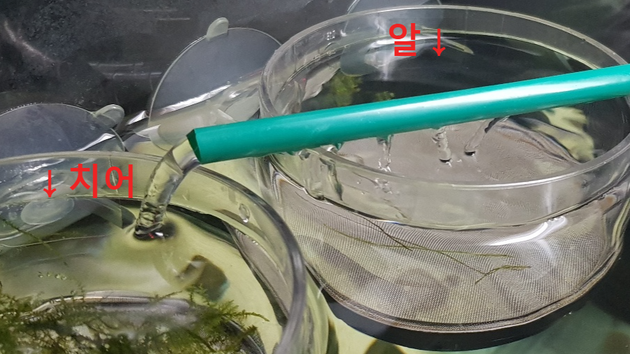 치어와 함께 두자니 브라인 줄떄마다 알에 지저분하게 붙고 먹고남은 브라인 청소할때 알까지 빨려들어가는 경우가 생길것 같아 알과 치어만 구분해서 부화통을 따로 만들었습니다. 현재 알은 22개, 치어는 6마리가 있습니다.