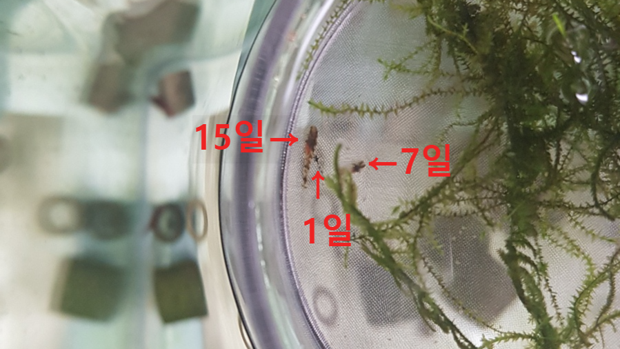 치어들을 부화시기 상관없이 한통에 몰아놓다보니 크기차이가 확연하게 보이네요. 약 2주동안 성장한 치어와 1일차를 비교해보면 어마어마하게 차이가납니다 ㄷㄷㄷ