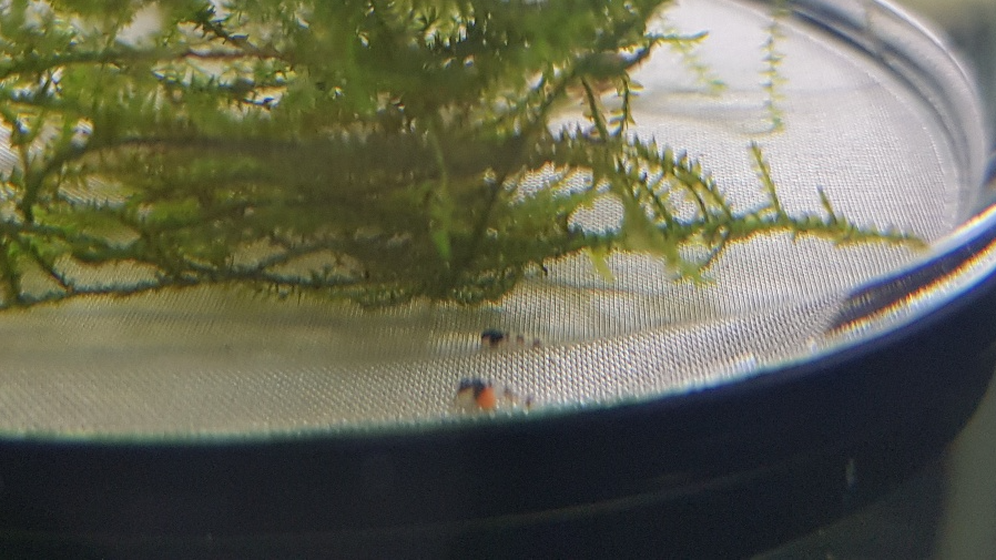 14마리 밖에 안되는데 알을 붙이기 시작하니까 거의 3~4일에 한번씩 붙이는것 같습니다;; 2~3마리가 군영에서 벗어나 돌아다니거나, 암놈이 위아래로 어항벽을 타는 경우 산란 징후였습니다. 어김없이 어항벽이나 모스사이에 알이 있네요.